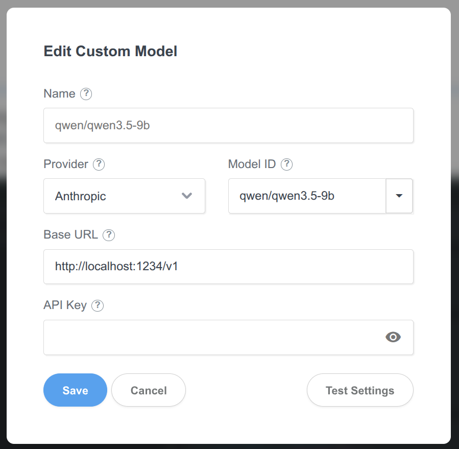 Here you need to enter a model id, Provider (this determines the API format/convention), base URL for the API and API key. You can obtain these from the docs of the relevant provider.